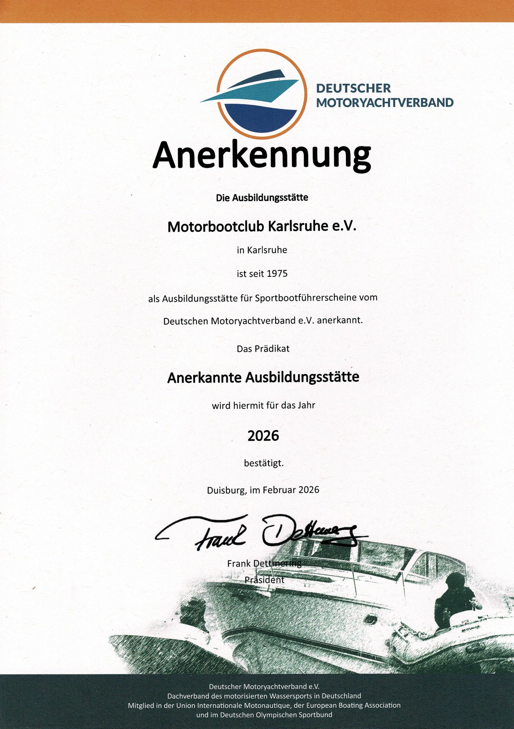 Die Ausbildung wird bei uns als anerkannte Ausbildungsstätte des Deutschen Motoryachtverbandes DMYV durchgeführt.